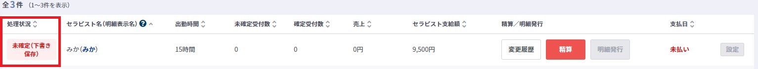 3.確定解除後、処理状況のステータスは「未確定(下書き保存)」に変更されます。