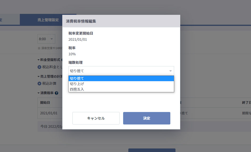 売上管理の消費税計算に適用される端数処理の設定ができます。