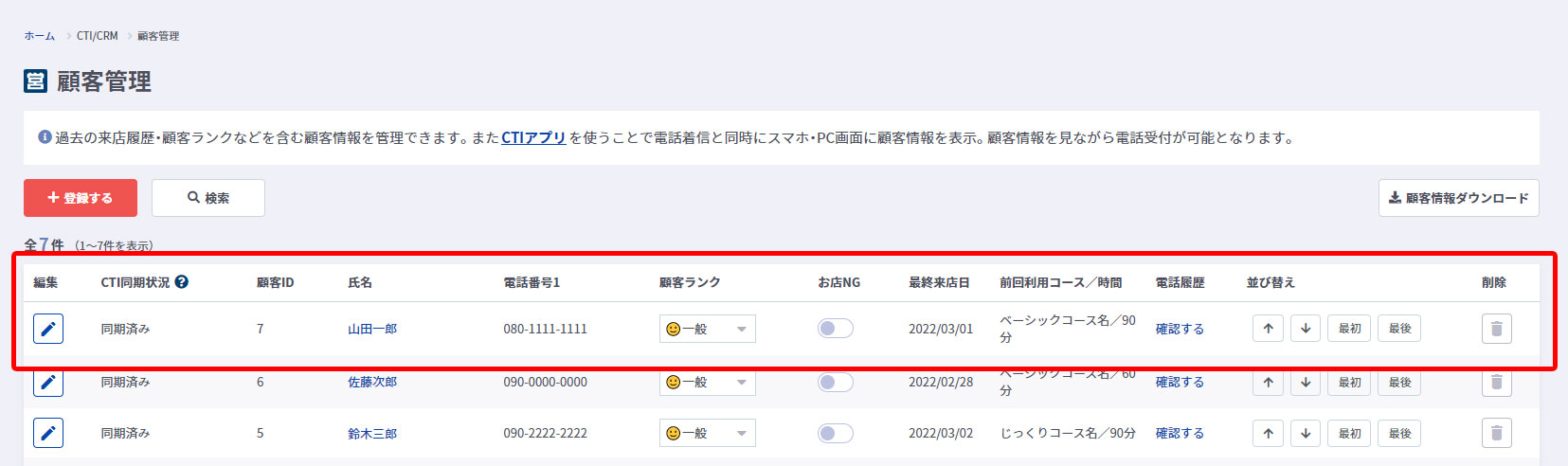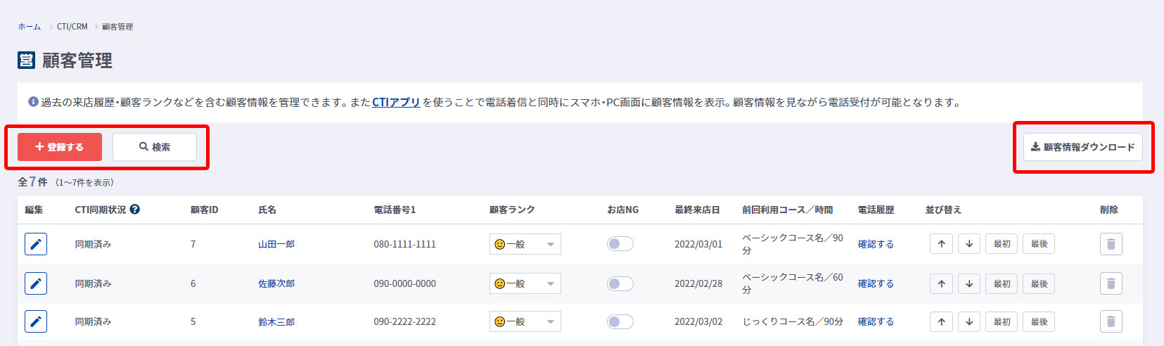 | 氏名 | 名前をクリックすると顧客編集画面が表示されます。 顧客詳細(登録・編集) |