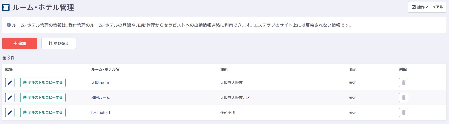 施術で利用するルームやホテルなど施設情報の管理全般・確認ができます。