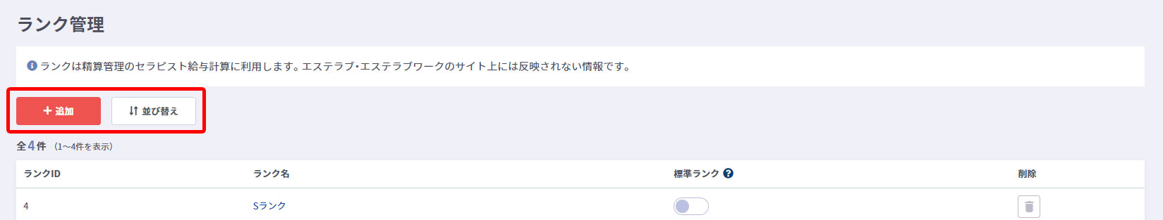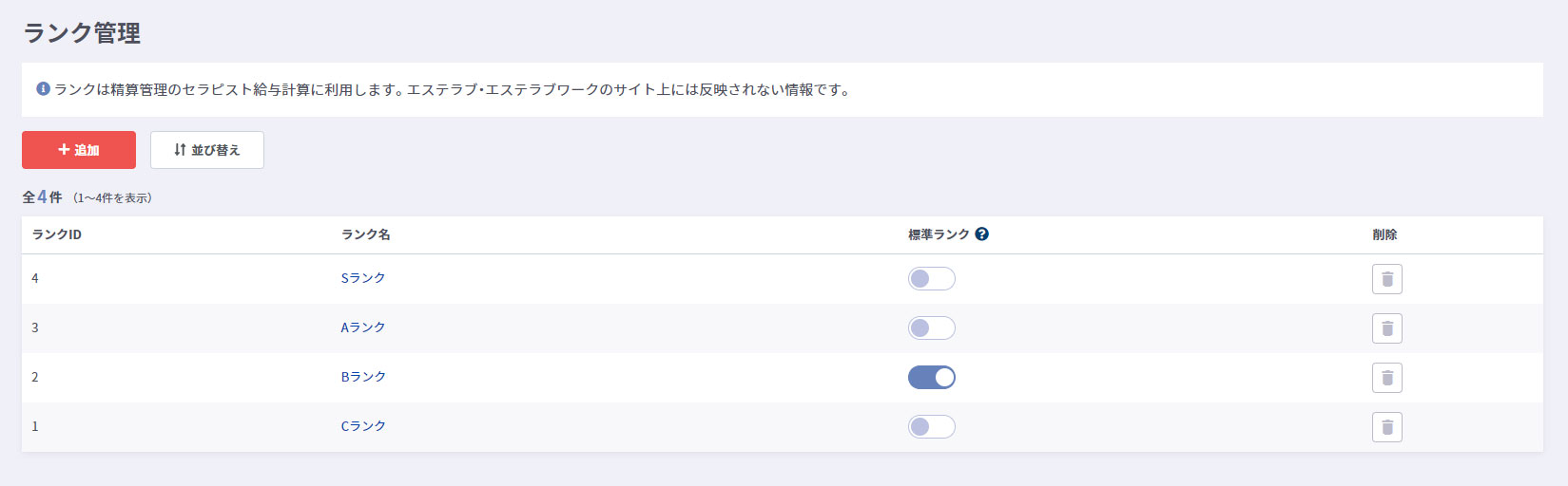 | 標準ランク | 新規セラピストの登録時に自動的に設定されるランクを設定できます。 |