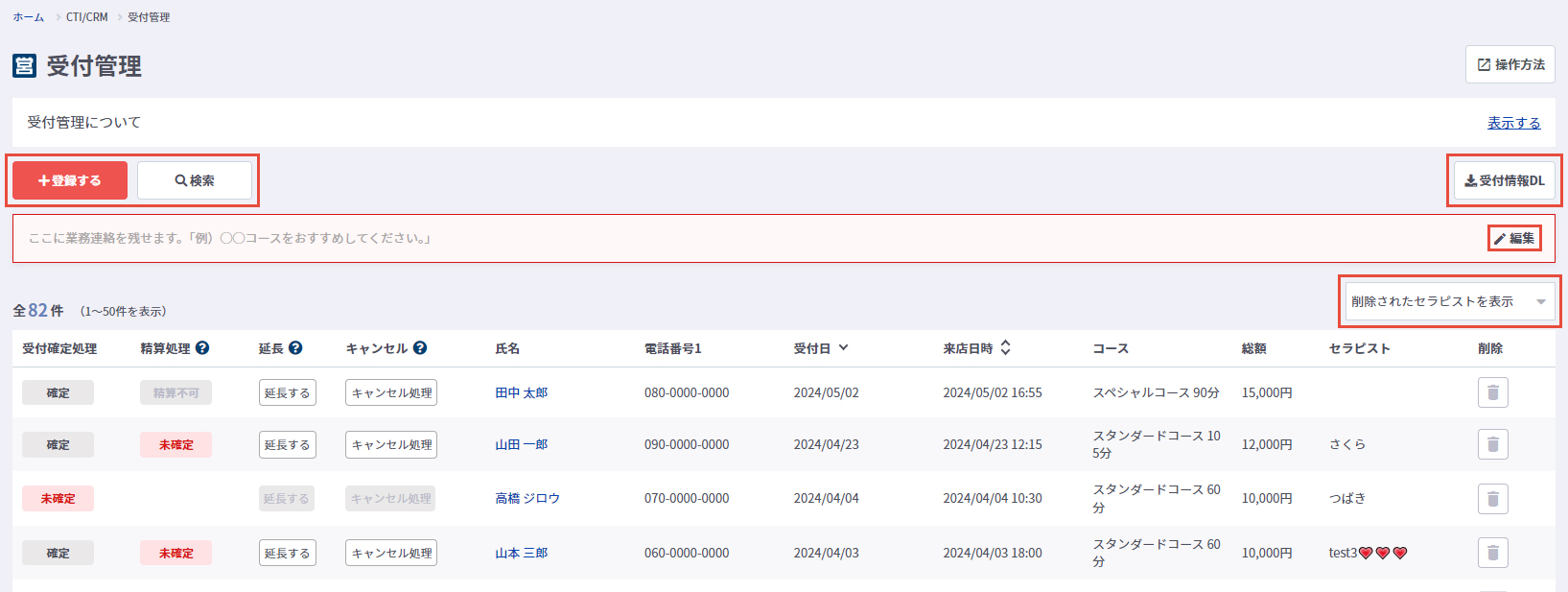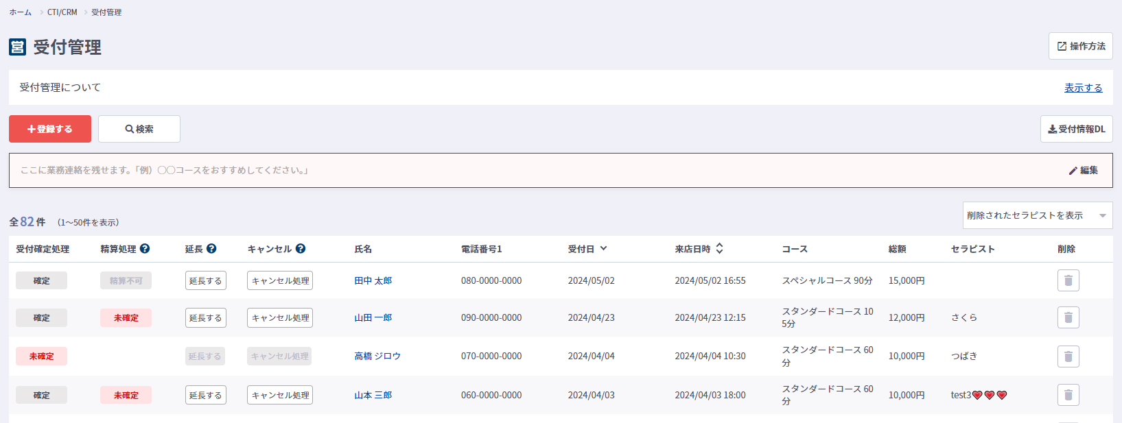 をクリックして、確認画面で「OK」を押すと受付情報が削除されます。