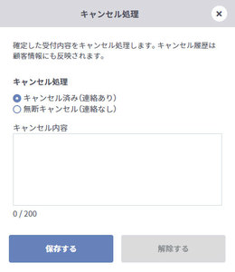 キャンセルを行った場合は、キャンセル済みと表示され、 氏名、電話番号1、受付日、来店日付に取り消し線が付けられます。