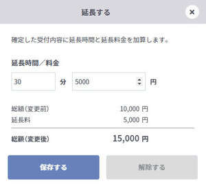 をクリックすると延長時間・料金を追加できる画面が表示されます。