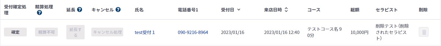 受付に登録されている担当セラピストがセラピスト管理から削除されると、受付管理の「延長」「キャンセル」「削除」操作はできません。また、担当セラピストに2名以上登録されている場合、1名以上が削除されると「延長」「キャンセル」「削除」操作はできません。