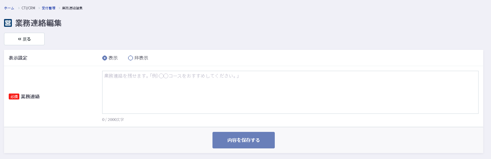 業務連絡の内容を編集する際に情報を入力します。 設定した内容は、受付登録画面に表示されます。