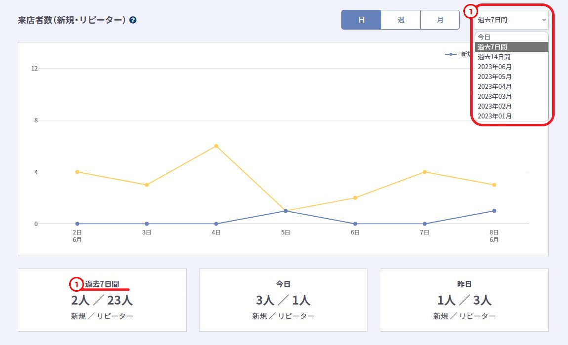 | グラフの表示・非表示 | 新規リピーターをクリックすることで、表示と非表示を設定できます。 新規リピーター非表示時は色が薄くなります。 |