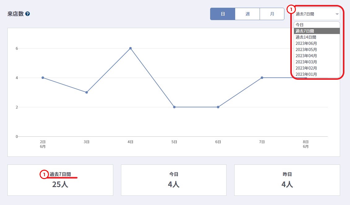 | 期間選択 | 選択した期間(図中①)でグラフを表示します。 また、該当する期間の合計人数を左下に表示します。 |