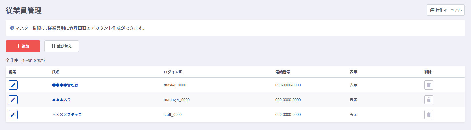 ※従業員アカウントの場合、新規追加、並び替え、削除を行うことはできません。