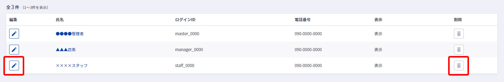 | 削除 | をクリックして、確認画面で「OK」を押すと従業員情報が削除されます。 |