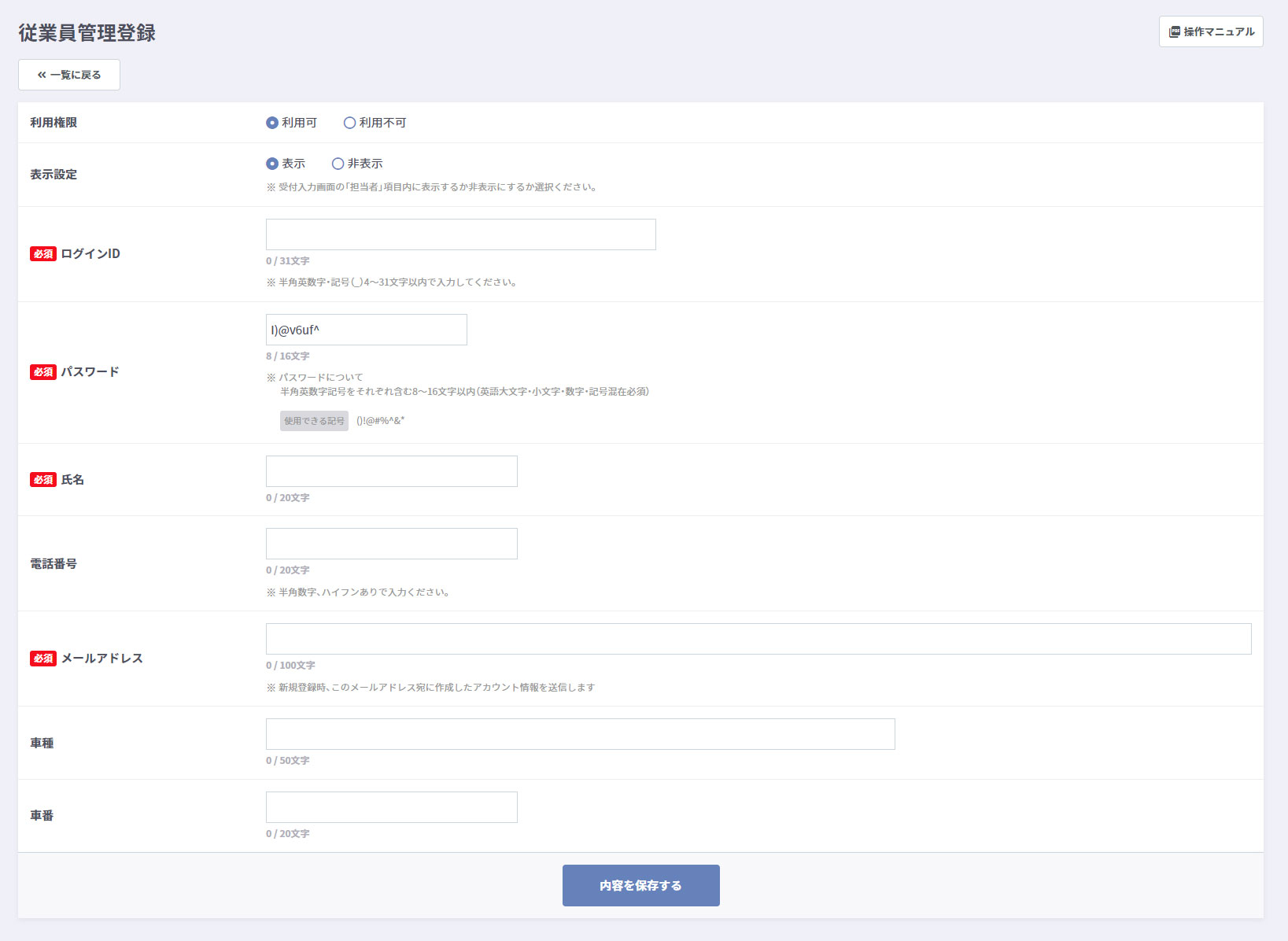 | 車番 | ドライバーを登録する際に送迎車の車番を20文字まで入力できます。 |