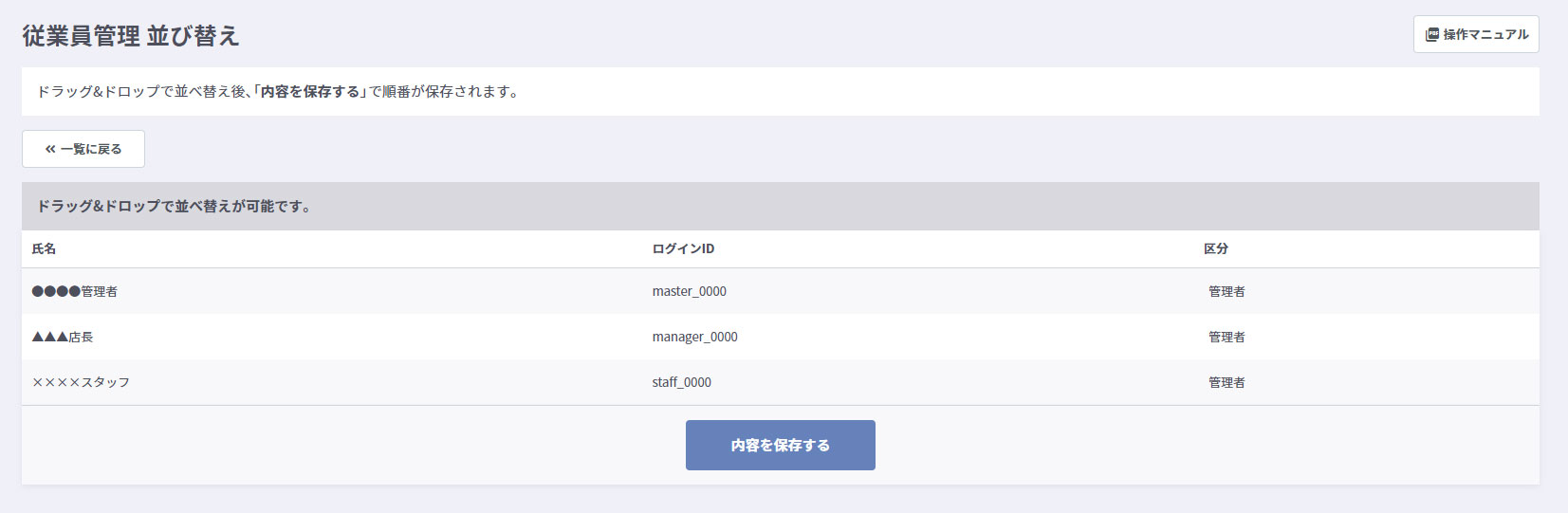 従業員一覧の並び順を設定します。 移動したい従業員の行をドラッグ&ドロップして移動させます。