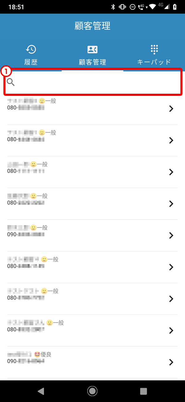 虫眼鏡のアイコンをタップすることで、氏名による検索を行うことが出来ます。(図中①)