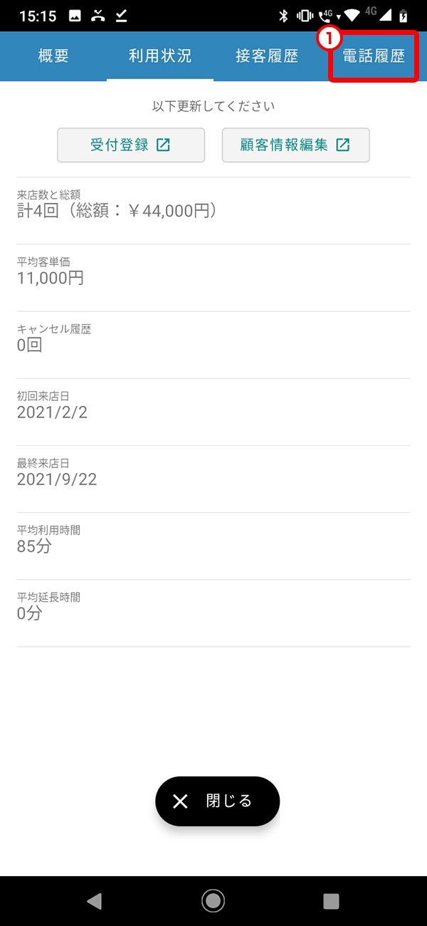 ※「顧客管理」から「概要」にアクセスした場合、電話履歴タブは表示されません(図中1)