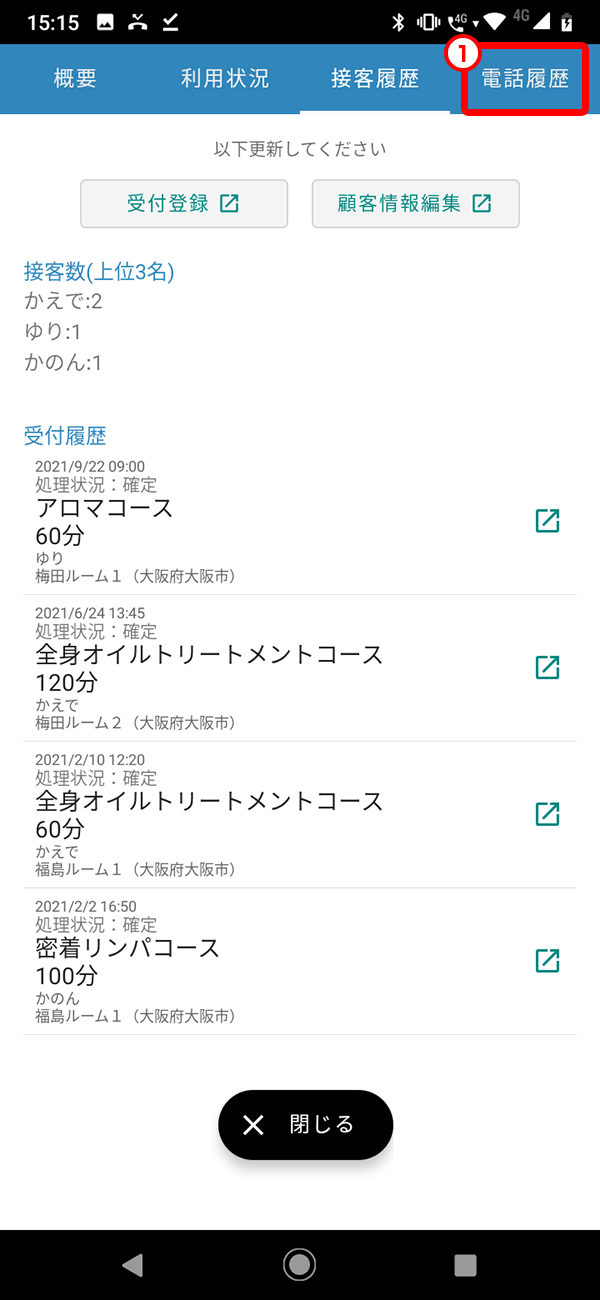 来店日時・処理状況、コース名・コース時間・接客したセラピストが表示されます。