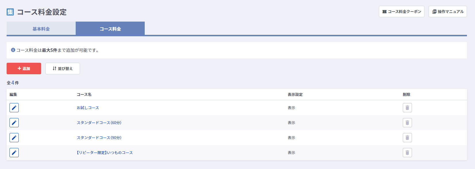 | コース名 | コース名をクリックするとコース料金編集画面が表示されます コース料金を登録・編集する(コース料金登録/編集) |