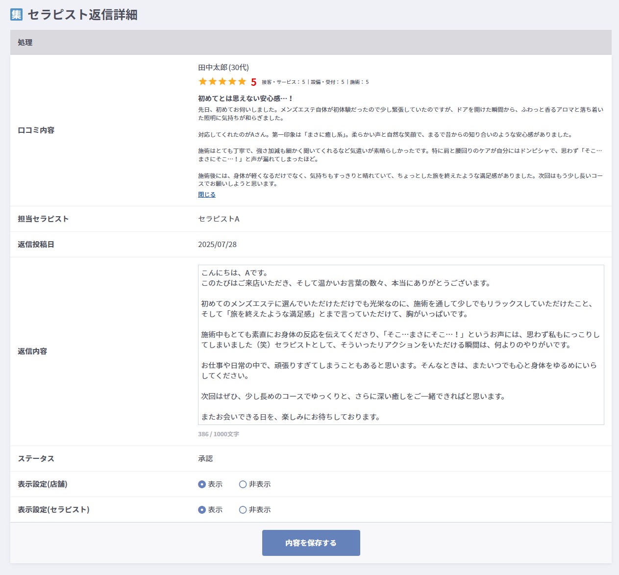 セラピストが返信した口コミ内容の確認・修正と、ステータス変更・表示設定ができます。