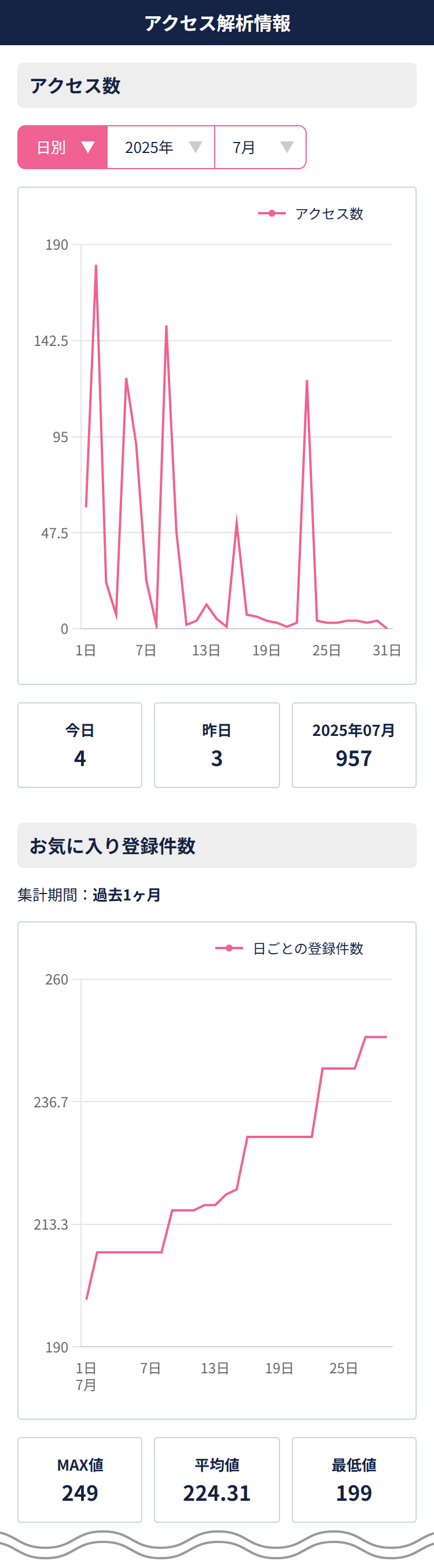 | お気に入り登録件数 | お気に入り登録数が確認できます。 集計期間は過去1か月間です。 |