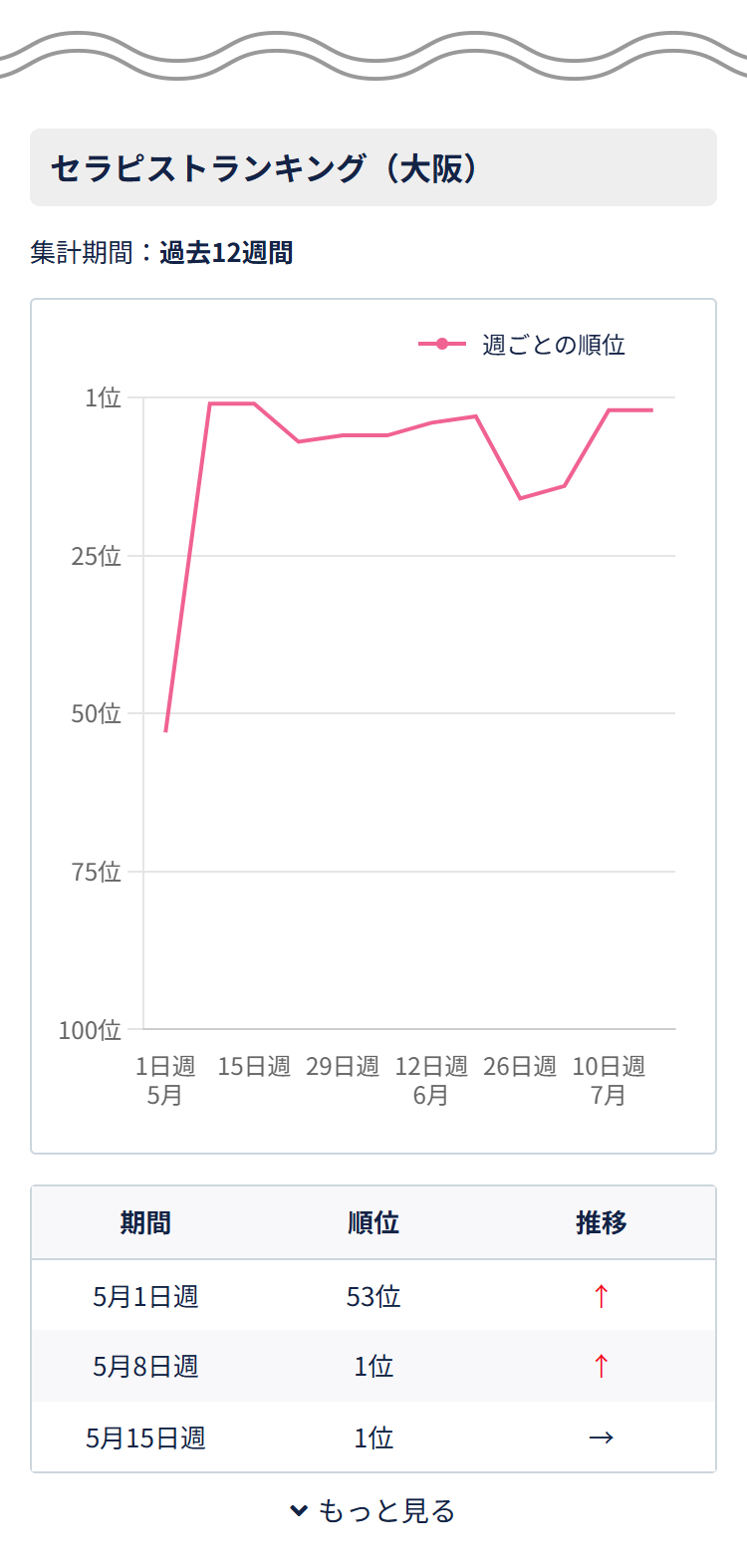 | セラピストランキング(地域) | 市区町村など、地域単位のセラピストランキング順位です。 集計期間は過去12週間です。 |