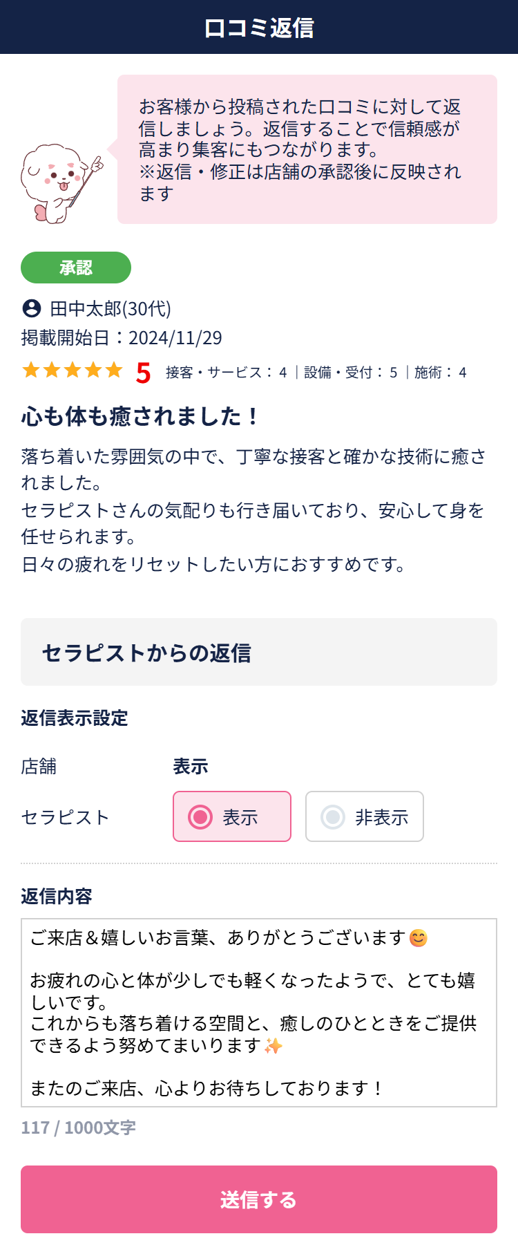 | 返信内容 | 口コミへの返信内容を、1,000文字以内で入力できます。 |