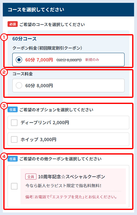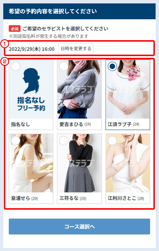 | セラピスト選択(図中②) | 希望日時に出勤登録があるセラピストを一覧表示しています。 セラピスト管理 または 出勤管理 から編集可能です。 また、ネット予約の利用設定から、「指名なしのフリー予約」を選択できないようにすることも可能です。 ネット予約の利用方法 |