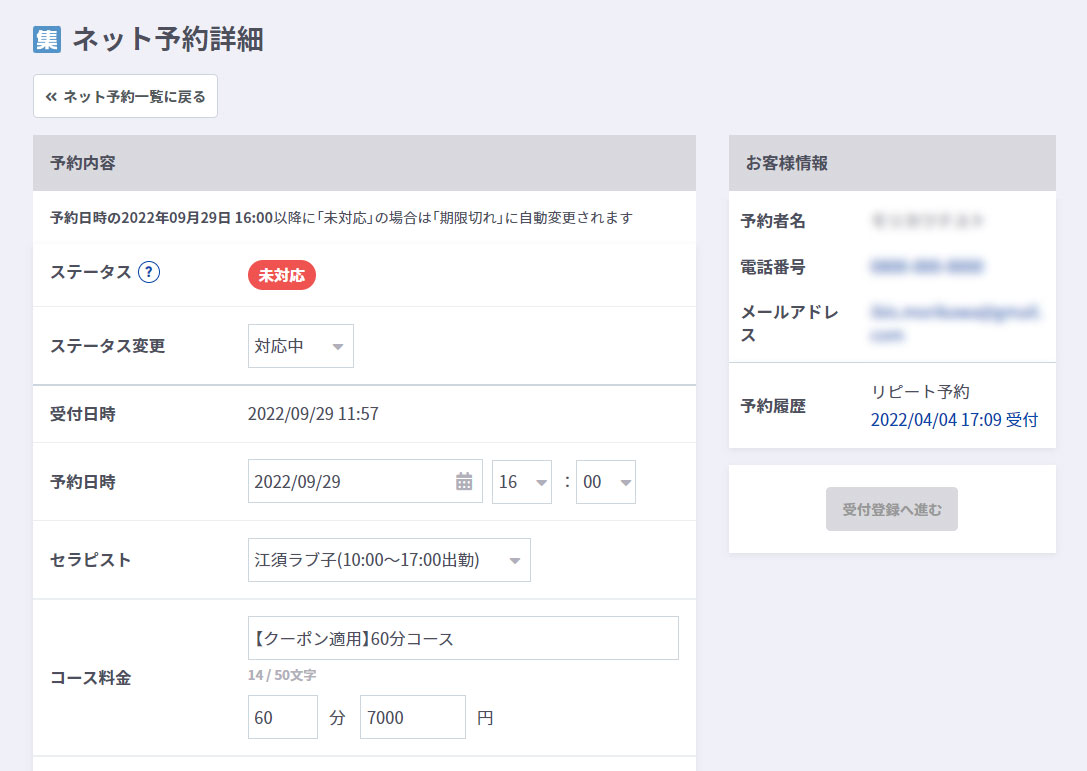| 予約受付処理 | 店舗管理画面にリクエストされた予約情報が反映されますので、ネット予約詳細画面で確認・処理を行い受付を完了させます。 |