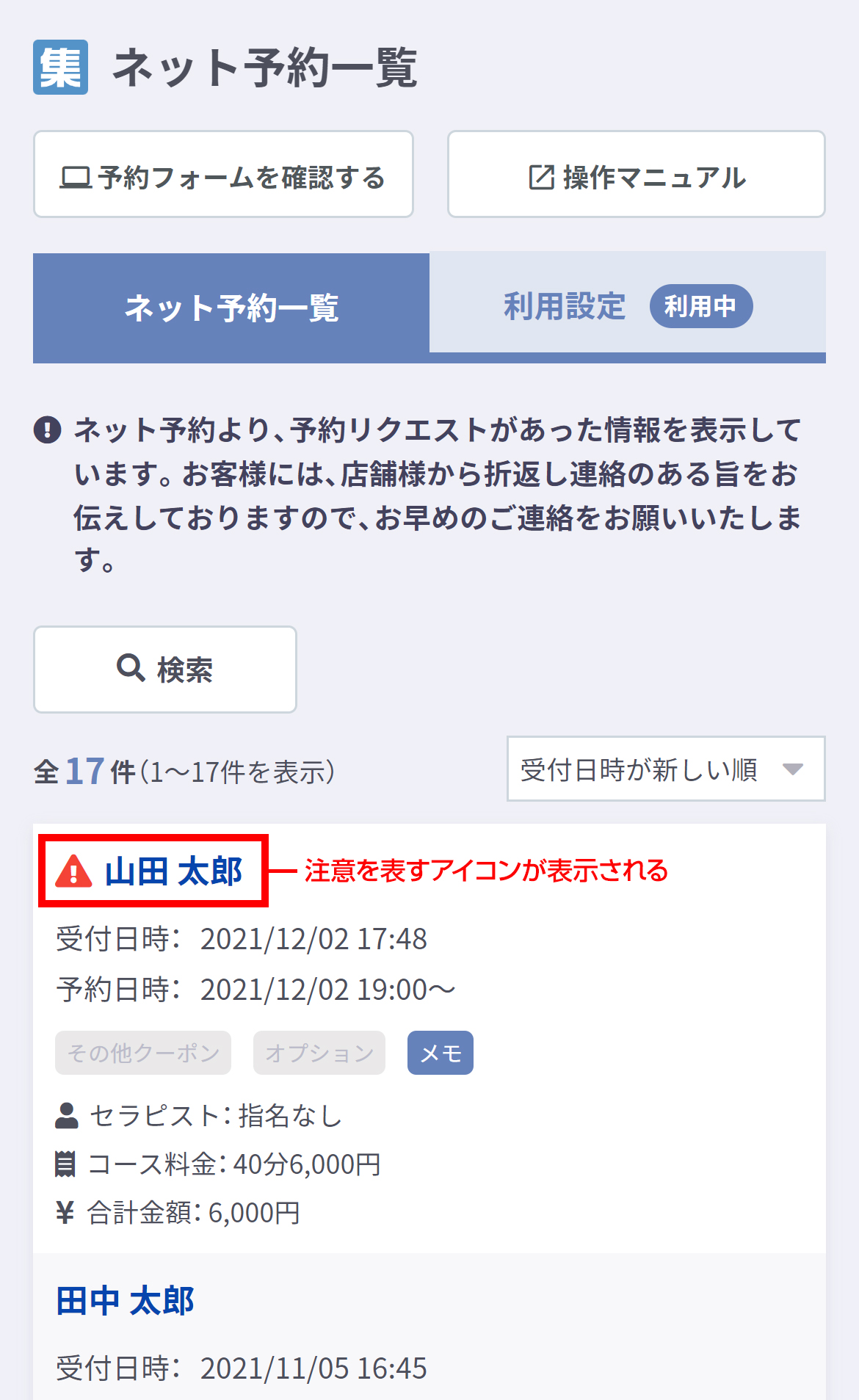 顧客管理でNGユーザーまたは要注意人物での情報が登録されている場合、ネット予約一覧では注意を表すアイコンが氏名の前に表示されます。また該当のネット予約の詳細画面にもアラート文が表示されます。