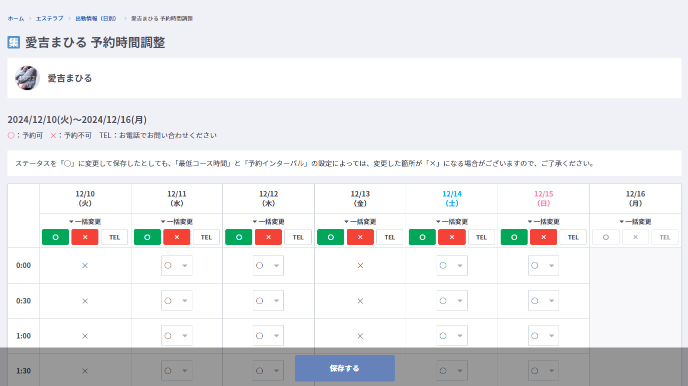 | プルダウンからネット予約のステータス「〇」、「×」、「TEL」を編集することができます。 変更したステータスは掲載ページ(集客)のセラピストごとのネット予約画面に反映されます。 「〇」から「×」または「TEL」への変更時、予約インターバル設定、予約状況などによっては、変更箇所直前のネット予約ステータスが自動的に「×」または「TEL」に変わることがあります。 | |