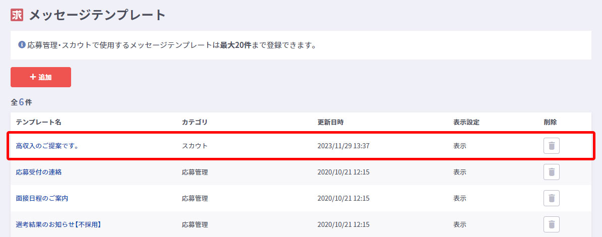 応募管理・スカウトメッセージで使用するメッセージテンプレートを最大20件まで管理ができます。デフォルトでサンプルテンプレートも提供していますのでご活用ください。