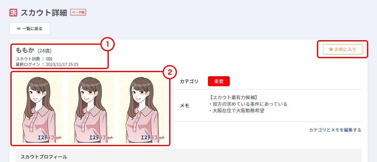 | 基本情報(図中①) | 『女の子の名前』『年齢』『最終ログイン日』が表示されます。 『スカウト回数』は貴店から対象の女の子へのスカウト数(累計)が表示されます。 『スカウト履歴』は遷移先ページで対象の女の子への送信履歴が確認できます。 スカウト履歴管理詳細 |