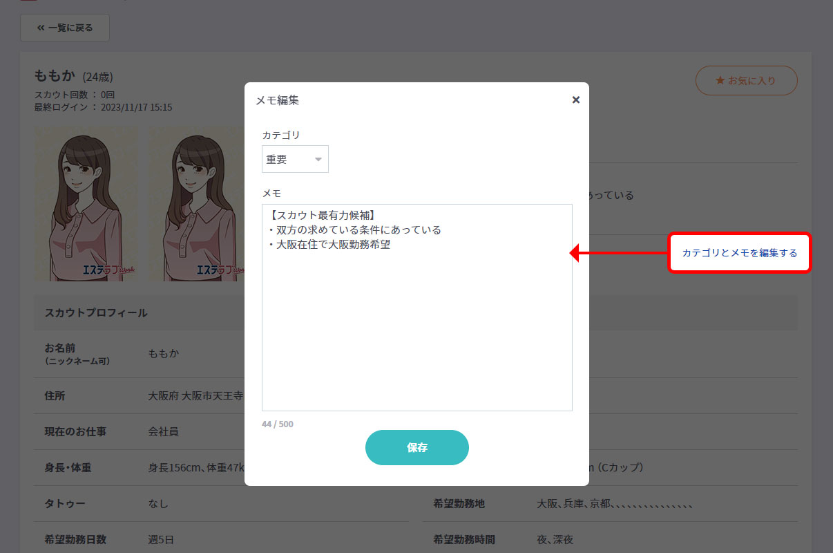 | 女の子へのスカウト回数 | 貴店から対象の女の子へのスカウト数(累計)が表示されます。 スカウト履歴管理詳細 |