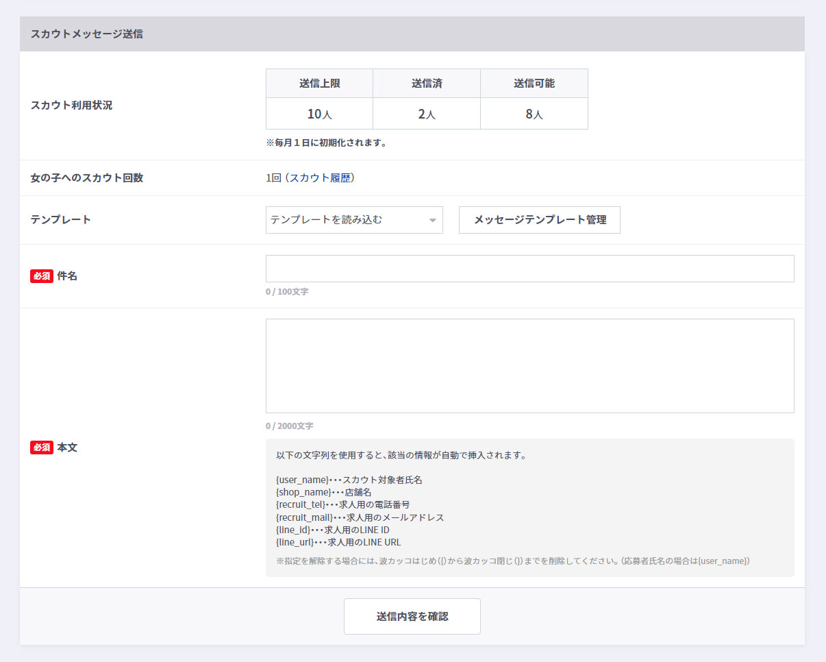| 本文 | スカウトメッセージの本文を入力します。 本文内では置換タグ利用が可能です。 以下の文字列を使用すると、該当の情報が自動で挿入されます。 {user_name}・・・スカウト対象者氏名 {shop_name}・・・店舗名 {recruit_tel}・・・求人用の電話番号 {recruit_mail}・・・求人用のメールアドレス {line_id}・・・求人用のLINE ID {line_url}・・・求人用のLINE URL |