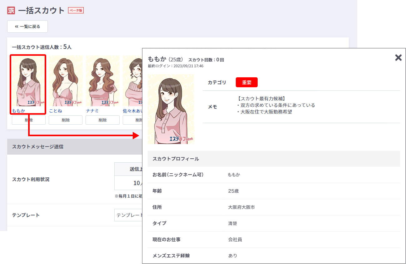 | 女の子へのスカウト回数 | 貴店から対象の女の子へのスカウト数(累計)が表示されます。 『スカウト履歴』は遷移先ページで対象の女の子へとの送受信履歴が確認できます。 スカウト履歴管理 |