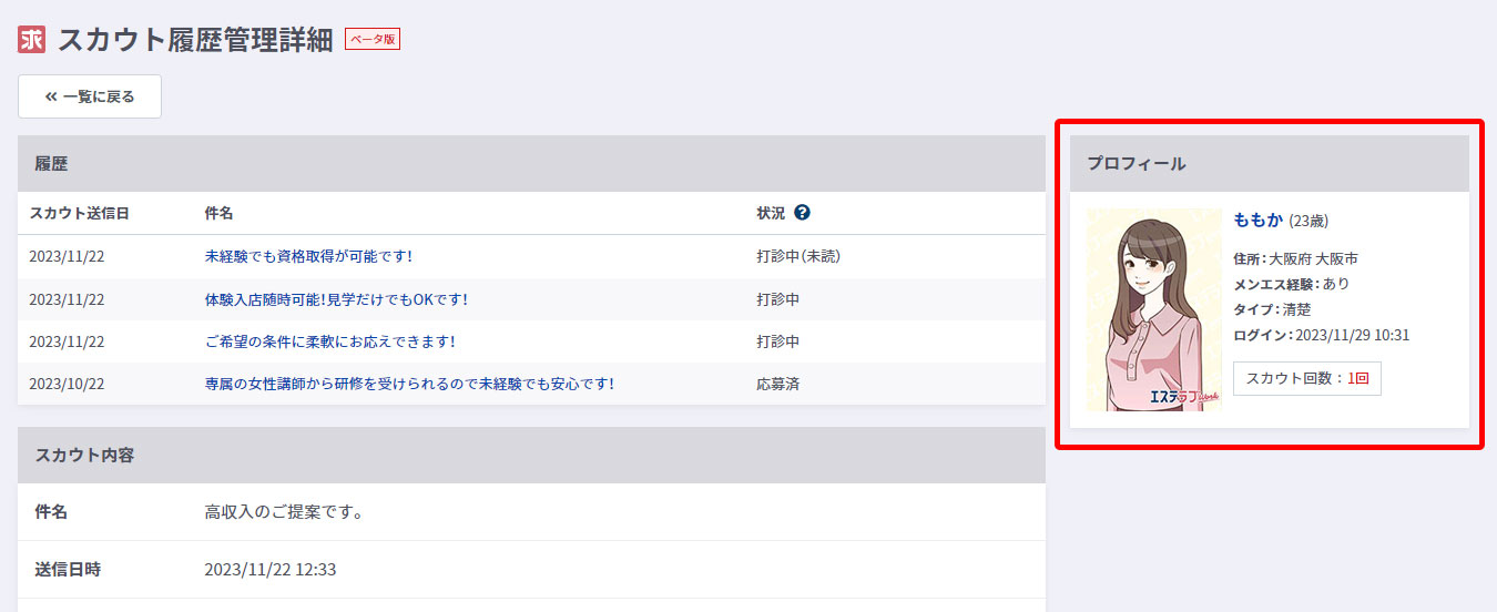 対象の女の子へのスカウトメッセージの送信履歴が確認できます。