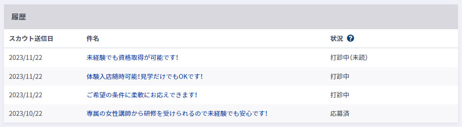 | 件名 | 送信したスカウトメッセージの件名が表示されます。 テキストリンクをクリックすることで、下部に表示されている「スカウト内容」にメッセージ内容が反映され表示されます。 |