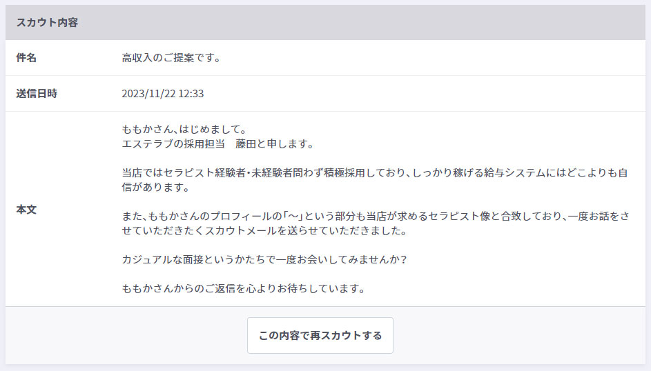 | ボタンを押すとスカウト詳細画面へ遷移します。 遷移後、スカウトメッセージ送信ブロックの件名と本文に履歴と同内容が自動でペーストされます。 送信前にメッセージの内容を編集することも可能です。 スカウト詳細 |